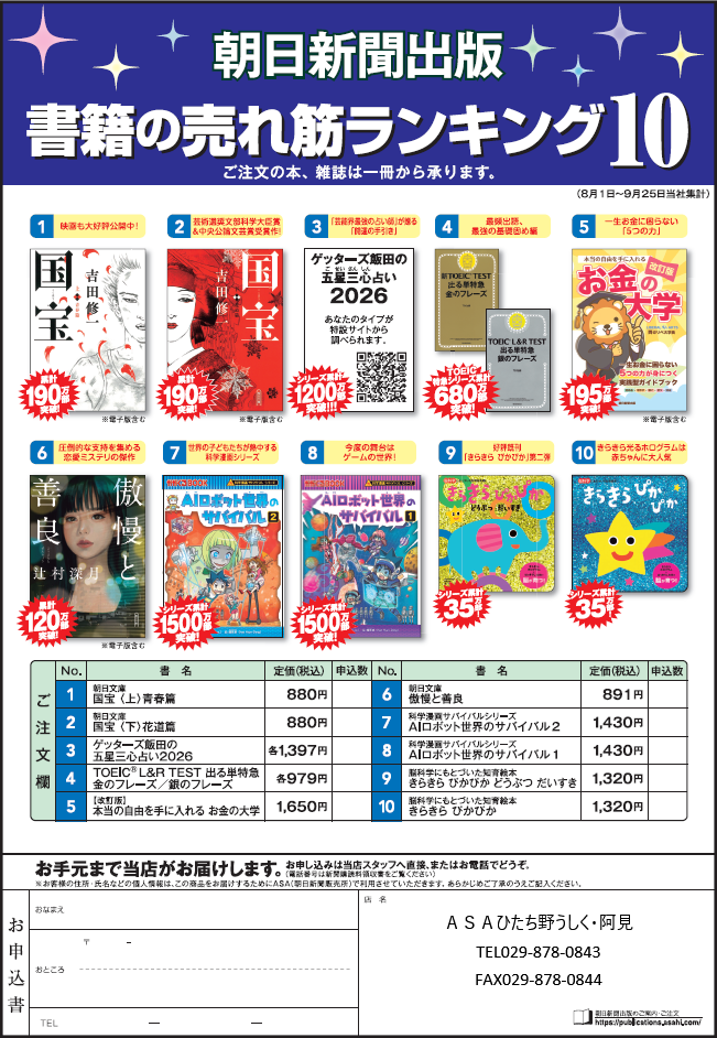 2025年10月14日 出版物 ■朝日新聞出版■「書籍の売れ筋ランキングベスト10」 ● 映画も大好評公開中!芸術選奨文部科学大臣賞&中央公論文芸賞受賞! 朝日文庫「国宝 〈上〉青春篇・〈下〉花道篇」 ●「芸能界最強の占い師」が贈る「開運の手引き」 ゲッターズ飯田 五星三心占い2026 ● 一生お金に困らない『5つの力』! 【改訂版】「本当の自由を手に入れる お金の大学」など 書籍の売れ筋商品10点をまとめて紹介しております。