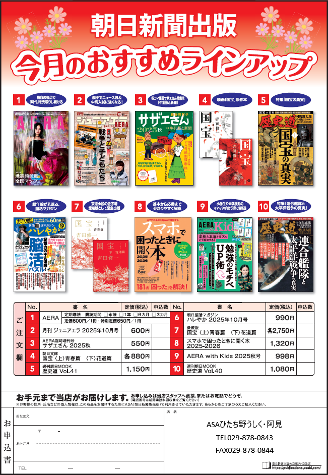 2025年10月14日 出版物 ■朝日新聞出版■売れ筋出版物「今月のおすすめラインアップ」 ●四コマ漫画サザエさん特集は「牛乳瓶と新聞」 AERA臨時増刊号 サザエさん 2025秋 ●特集「国宝の真実」 週刊朝日MOOK 歴史道Vol.41 ●基本から応用まで分かりやすく解説 スマホで困った時に開く本 2025-2026 売れ筋商品10点をまとめて紹介しております。