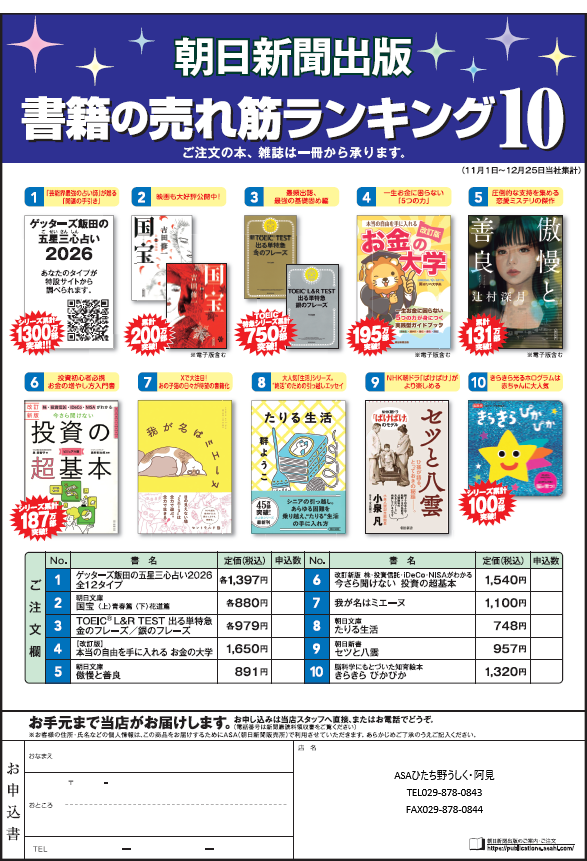 2026年1月 7日 出版物 ■朝日新聞出版■「書籍の売れ筋ランキングベスト10」 ●『芸能界最強の占い師』が贈る『開運の手引き』 「ゲッターズ飯田の 五星三心占い2026 全12タイプ」 ●投資初心者必携 お金の増やし方入門書 改訂新版 株・投資信託・iDeCo・NISAがわかる 「今さら聞けない 投資の超基本」 ●大人気「生活」シリーズ。”終活”のための引っ越しエッセイ 朝日文庫「たりる生活」 書籍の売れ筋商品10点をまとめて紹介しております。