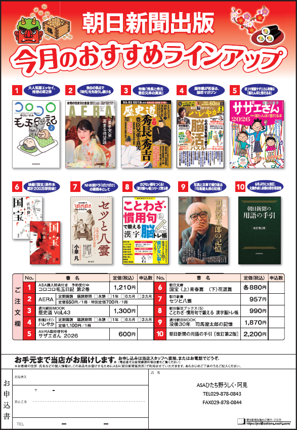 2026年2月 4日 出版物 ■朝日新聞出版■売れ筋出版物「今月のおすすめラインアップ」 ●NHK朝ドラ「ばけばけ」の副読本として 朝日新書 『セツと八雲』 ●写真と文章で振り返る「司馬遼太郎の記憶」 『週刊朝日MOOK 没後30年司馬遼太郎の記憶』 ●6年ぶりに大改訂。文書作成に必携の用字用語集 『朝日新聞の用語の手引き[改訂第2版]』 売れ筋商品10点をまとめて紹介しております。