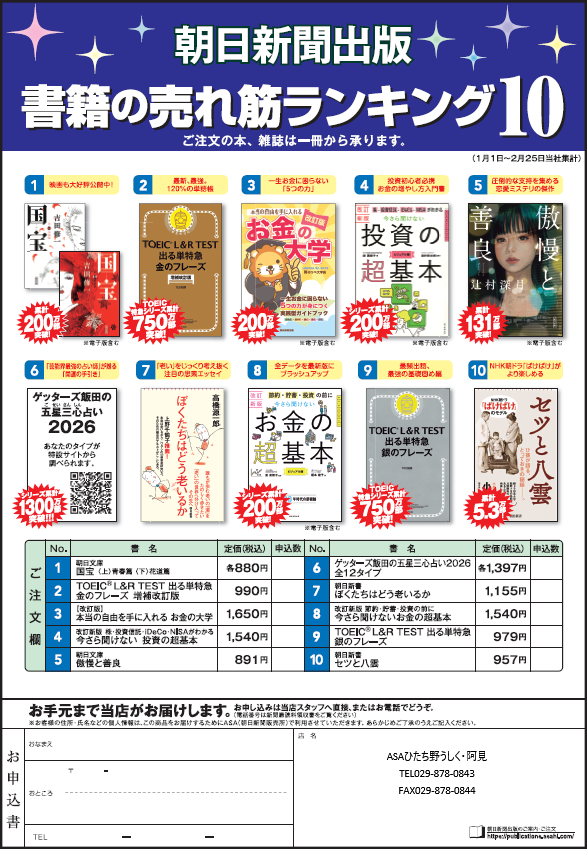 2026年3月12日 出版物 ■朝日新聞出版■「書籍の売れ筋ランキングベスト10」 ● 一生お金に困らない「5つの力」 【改訂版】『本当の自由を手に入れる お金の大学』 ●「老い」をじっくり考え抜く 注目の思索エッセイ 朝日新書『ぼくたちはどう老いるか』 ●全データを最新版にブラッシュアップ 改訂新版 節約・貯蓄・投資の前に 『今さら聞けないお金の超基本』
