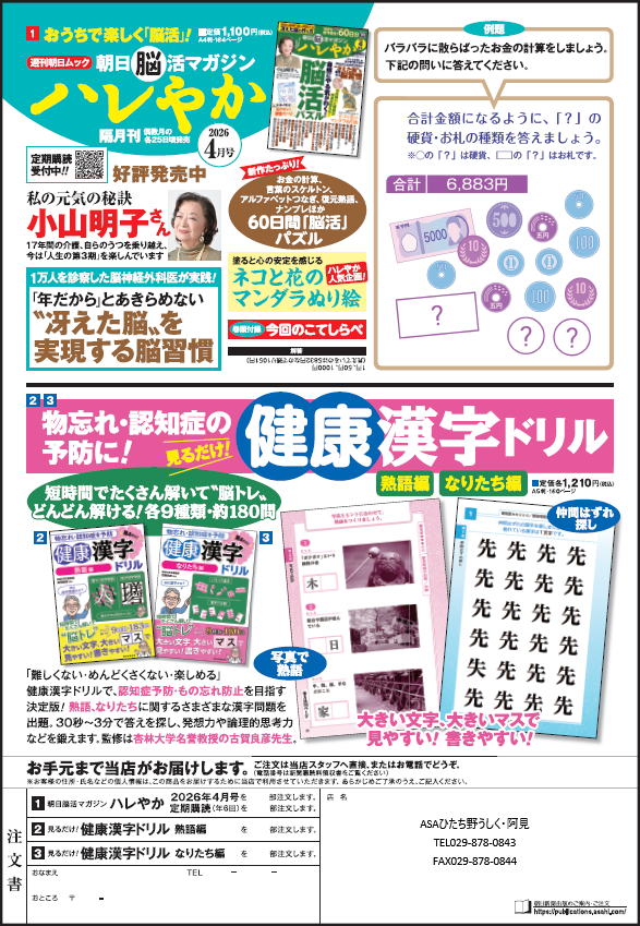 ●「週刊朝日ムック 朝日脳活マガジン ハレやか 2026年4月号」