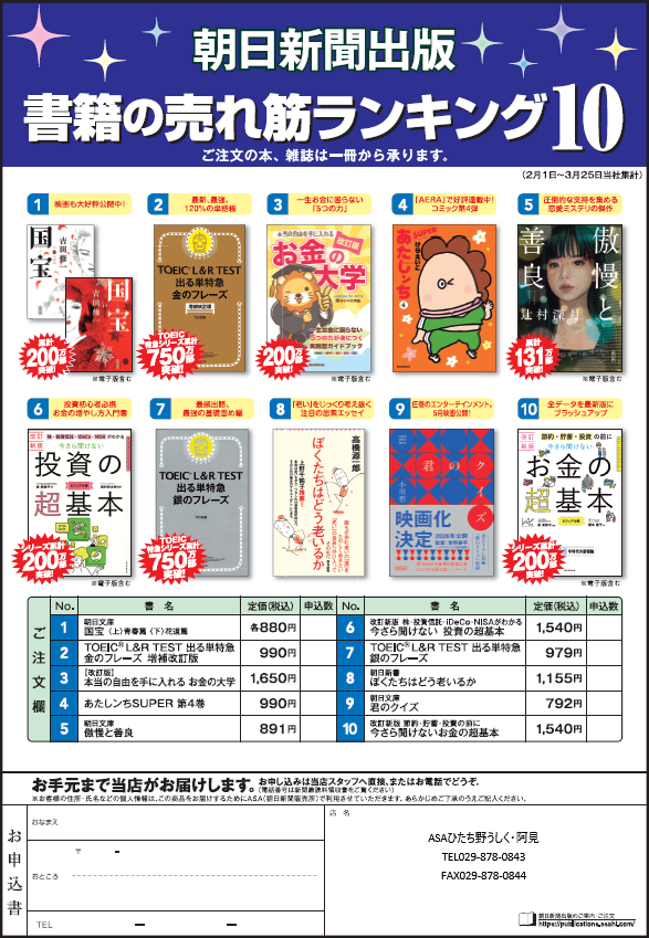 2026年4月 8日 出版物 ■朝日新聞出版■「書籍の売れ筋ランキングベスト10」 ● 一生お金に困らない「5つの力」 【改訂版】『本当の自由を手に入れる お金の大学』 ●「老い」をじっくり考え抜く 注目の思索エッセイ 朝日新書『ぼくたちはどう老いるか』 ●圧巻のエンターテインメント。5月映画公開! 朝日文庫『君のクイズ』 書籍の売れ筋商品10点をまとめて紹介しております。