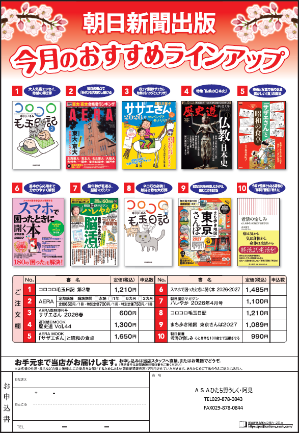 2026年4月 8日 出版物 ■朝日新聞出版■売れ筋出版物「今月のおすすめラインアップ」 ●四コマ漫画サザエさん 特集は「パンダとモナリザ」 AERA臨時増刊号 『サザエさん2026 春』 ●基本から応用まで分かりやすく解説 『スマホで困ったときに開く本2026-2027』 ●東京のまち歩きを楽しむガイド本。最新2027年改訂版 『まち歩き地図 東京さんぽ2027』 売れ筋商品10点をまとめて紹介しております。